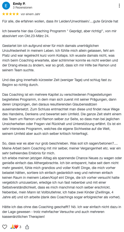 Wenn du dich in einem oder mehreren Punkten wiedererkennst, ist „Geprägt! Aber Richtig“ genau das Richtige für dich – eine Kombination der wirksamsten Bestandteile aus Schematherapie, Glaubenssatzarbeit und Verhaltenstherapie.