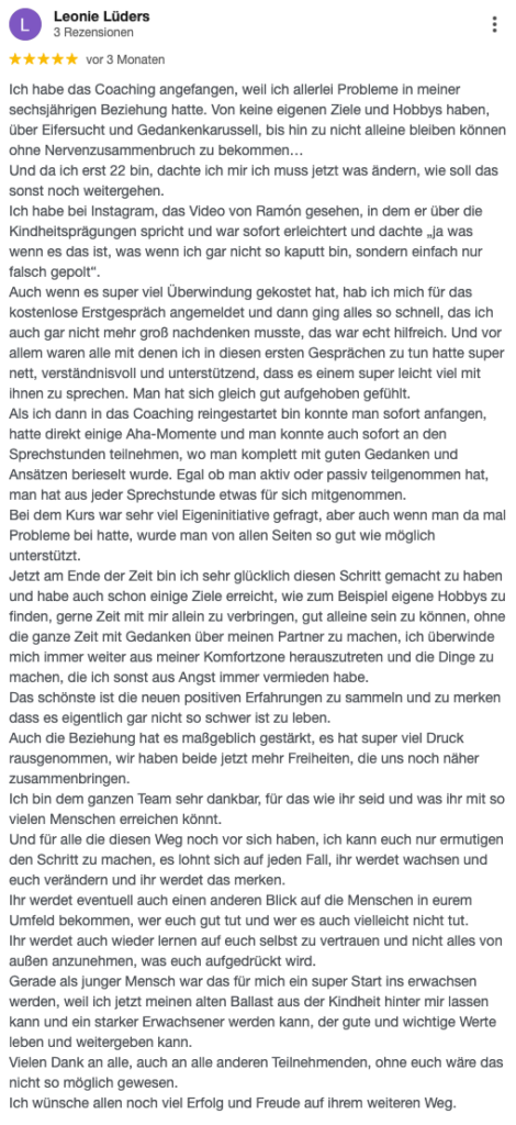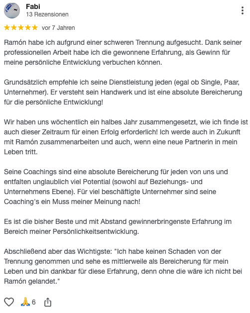 Fabian begann das Coaching nach einer schweren Trennung. Er hatte sich geschworen, das ihm so etwas nie wieder passieren sollte und nutzte das Coaching, um zu verstehen, wie es dazu kommen konnte, was SEINE Anteile waren und wie er es nächstes Mal besser machen könnte.