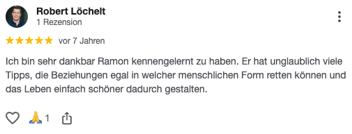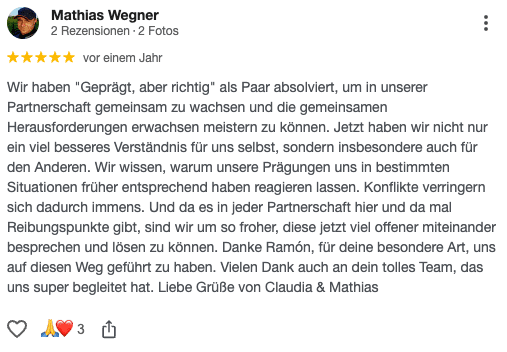 Thomas war in einer sehr konfliktbehafteten Beziehung als er zu Ramón kam. Seine Partnerin hatte sehr wenig Verständnis für seine selbstständige Tätigkeit und ihm fiel es sehr schwer, für sich einzustehen. Mittlerweile ist Thomas in einer Beziehung mit einer Frau, die wirklich zu ihm passt und hat die Fähigkeiten, sowohl sich selbst als auch sie glücklich zu machen.